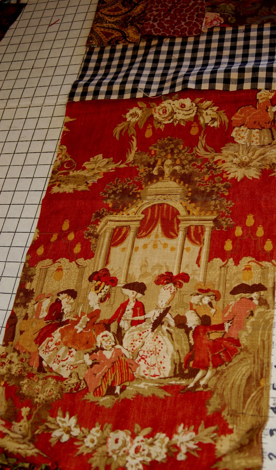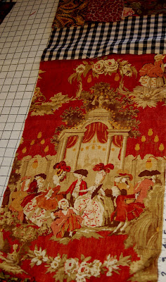 I chose this red toile as the center. I often prefer a non-directional pattern for the center...one that looks the same from either side of the runner. But I decided to work with the toile anyway because I love this fabric!