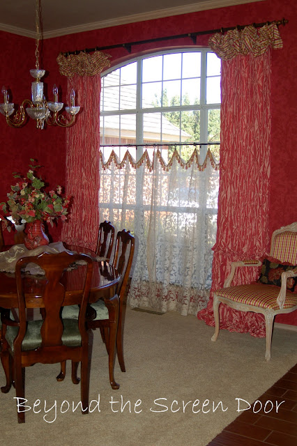 The large arched window in the dining room of my friend Lynda's home is framed by gorgeous pink window treatments. Lynda fell in love with this pink "button" fabric. The fabric is tufted into little "buttons" in a diamond pattern. I made floor length panels with the "poof" being made from a coordinating plaid fabric. We then added beautiful tone on tone floral print cafe sheers with a tassel trim detail. They turned out beautifully!