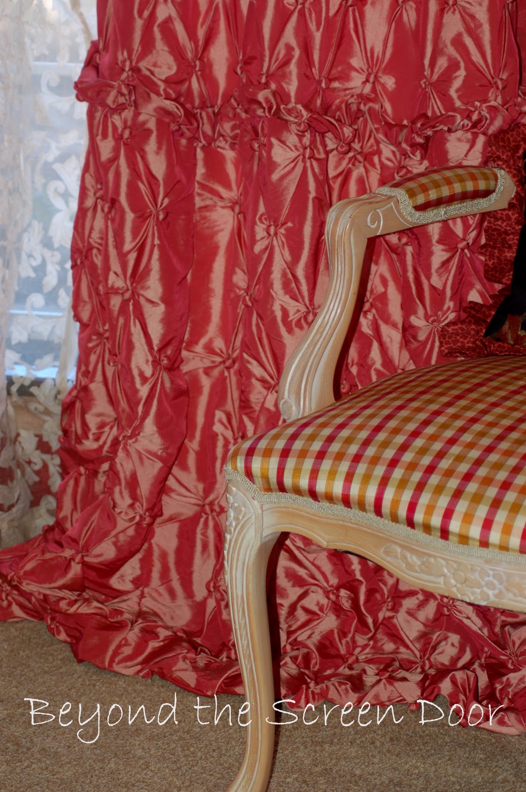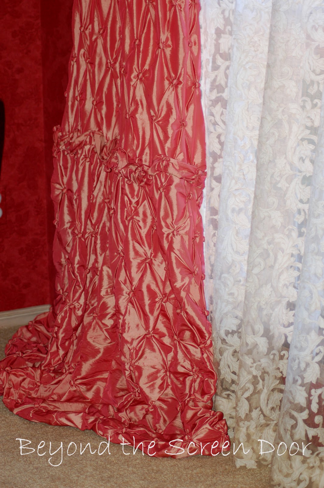 I apologize, but I never thought to take a picture of the damage. (This was before my blogging days!) Since the damage was contained at the bottom of the panels, I decided to add a gathered "skirt". (You can see the before HERE.)