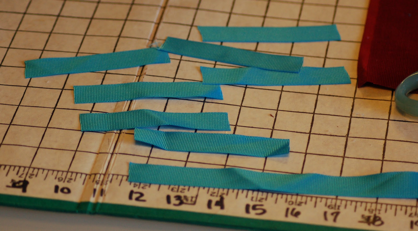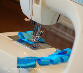 Next I cut several pieces, 4" in length, from 1" wide turquoise grosgrain ribbon.Folding the ribbon in half to create a loop, I then sewed the ribbon loops together to form a sort-of hand made loop "fringe".