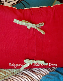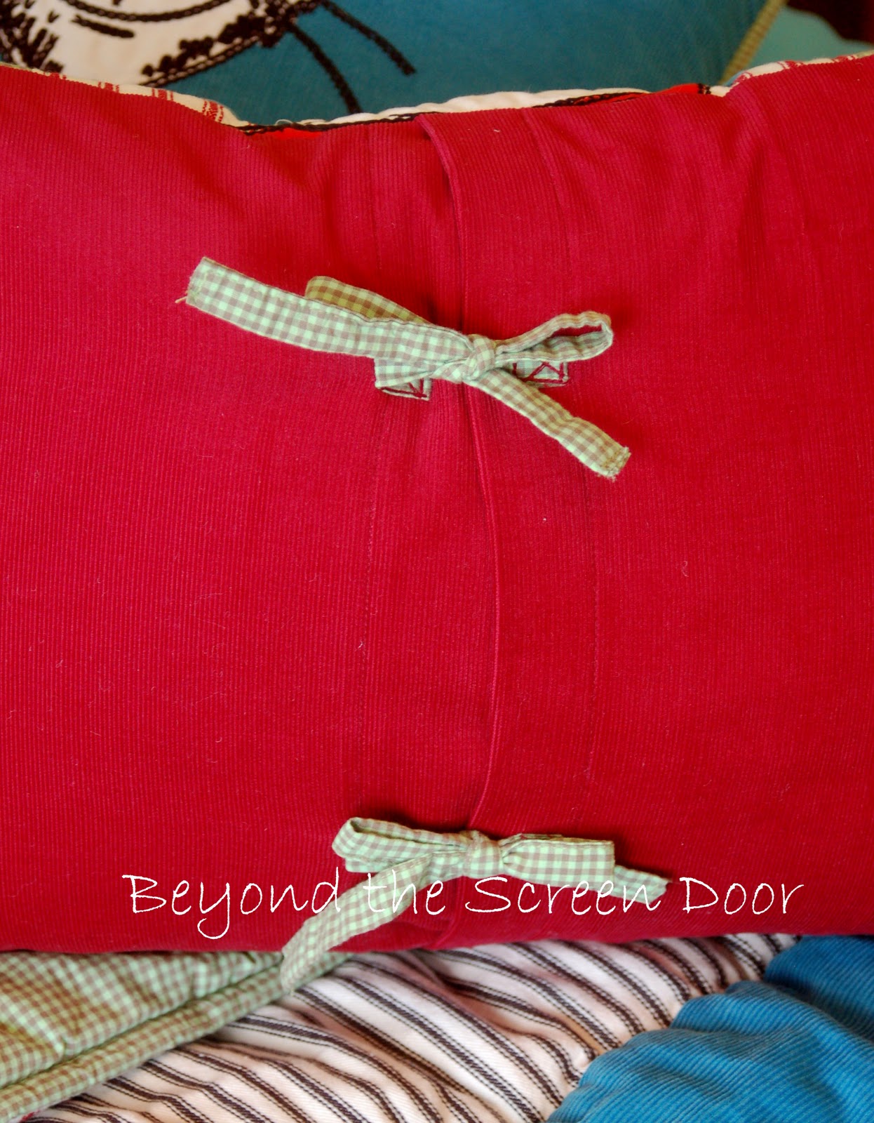 The back of the pillow was made envelope style from the red corduroy. The pillow closes with two ties made from the leftover green check fabric.