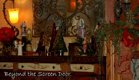 We continued with a red, gold and bronze color scheme on her mantle.  Shelli purchased the "weeping" garland last year on a family Christmas trip to Wyoming.