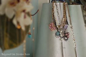hangs them from the finial on a lamp! Isn't this a clever idea? Who says your jewelery has to be kept in a drawer or a closet! Keep them where you can see and enjoy them! It adds an additional sparkle to the bathroom!
