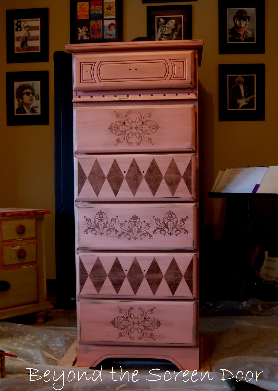 Hi Sonya! That dresser is absolutely darling! I love the damask pattern and that brown/pink combo is perfect. But, what I really can't get over is how amazing that artwork is! You and your hubby are seriously talented! Does he ever sell them? That Bono one caught my eye as U2 is my husband's favorite group of all time.