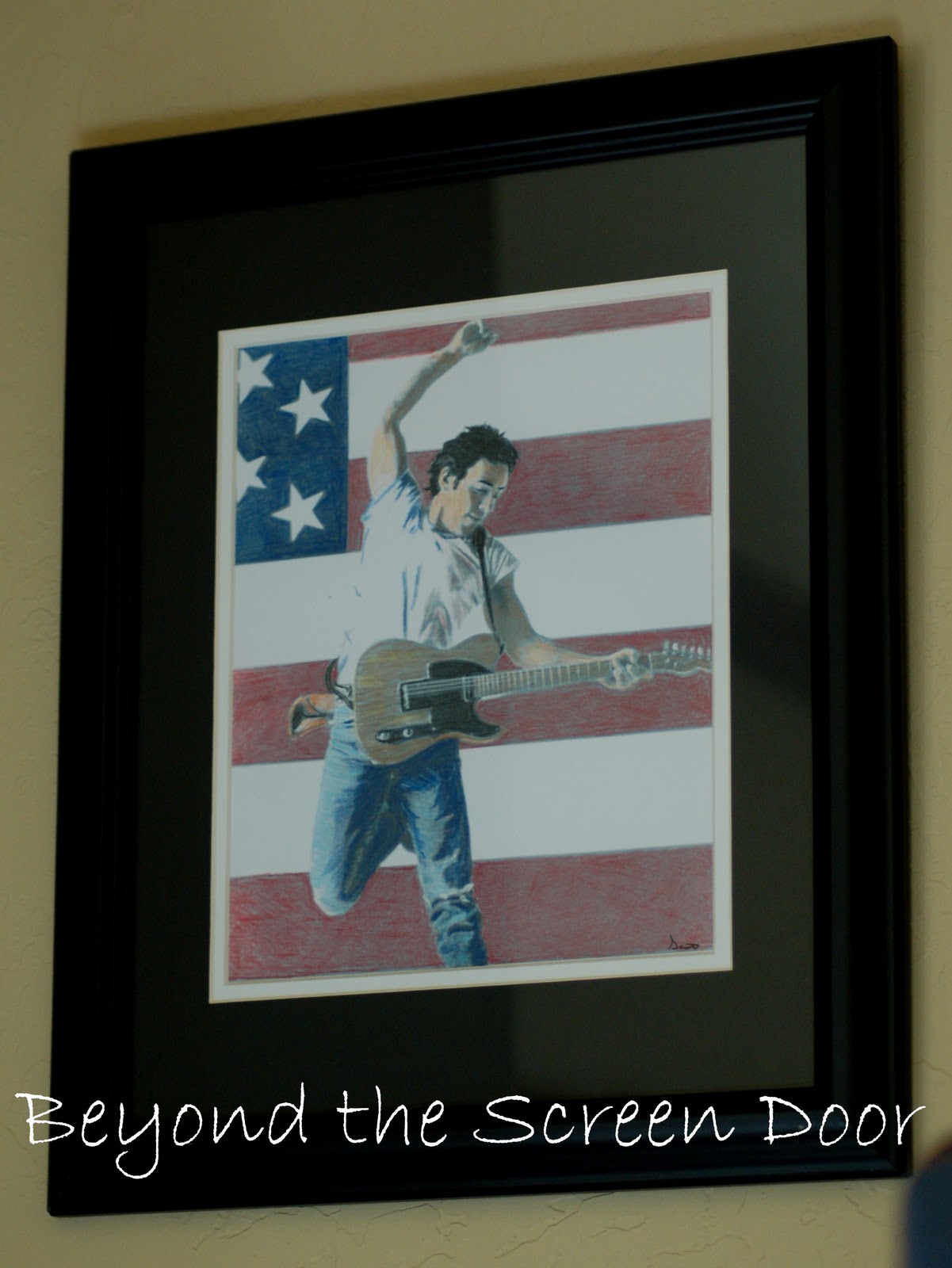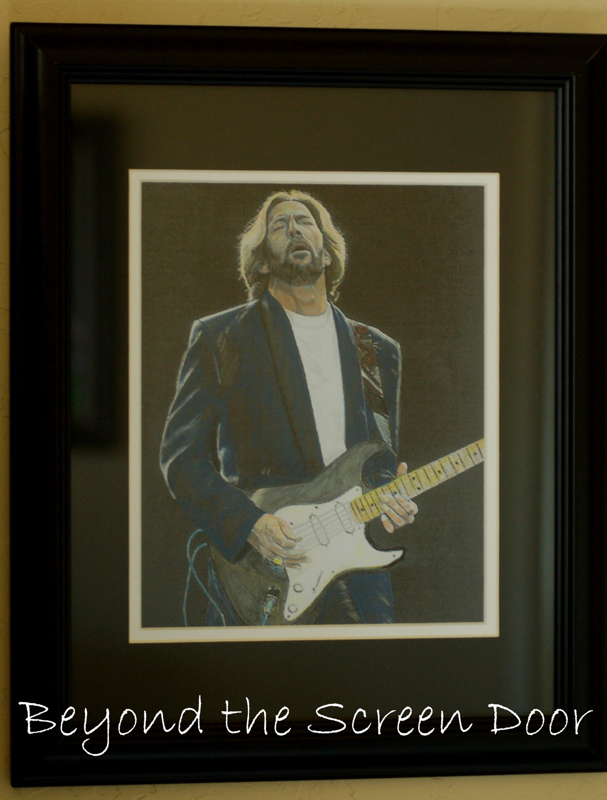 This is where we keep all of my husband's music, guitars (right side, above), his "music legends" artwork and, of course, the computer.