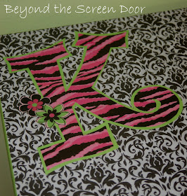 To create the "K", I found a font I liked on the computer, enlarged the K to the size I wanted, printed it off, cut it out and traced the K onto scrapbook paper. After cutting out the zebra K, I backed it with the lime green to give it more dimension. The flowers were cut straight from scrapbook paper. Everything was then decoupaged onto the desk.