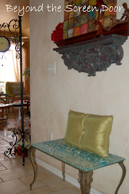 Cute bench...and I love that beautiful little chandelier!