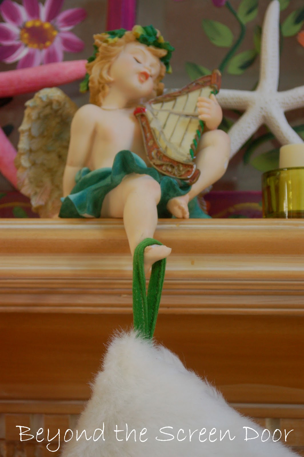 I want to come over and hang out! The cherub with the stocking on it's foot--adorable! Was that a really stocking holder, or something she did? I also love that caged lady. The flooring caught my eye right away, too.