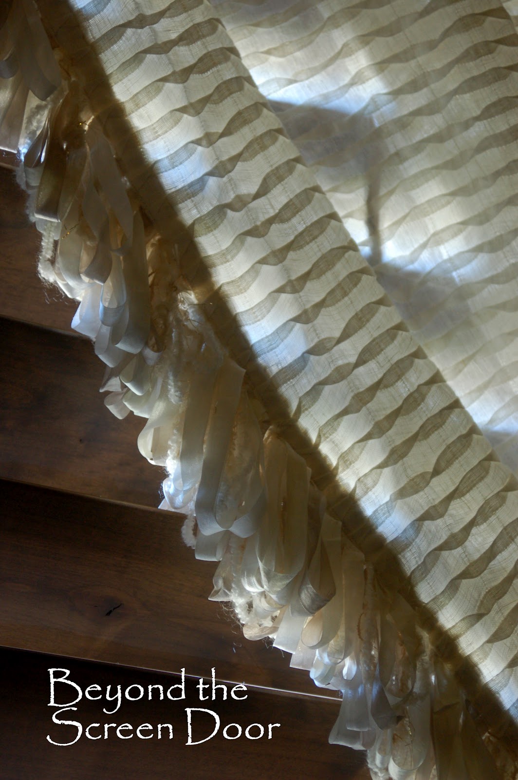 10. It is sooo gorgeous. I love how the light shines through and highlights the fabric design. My jaw about hit the table when I saw the close-up of the fringe...WOW! Did it take you a week to do that? :)