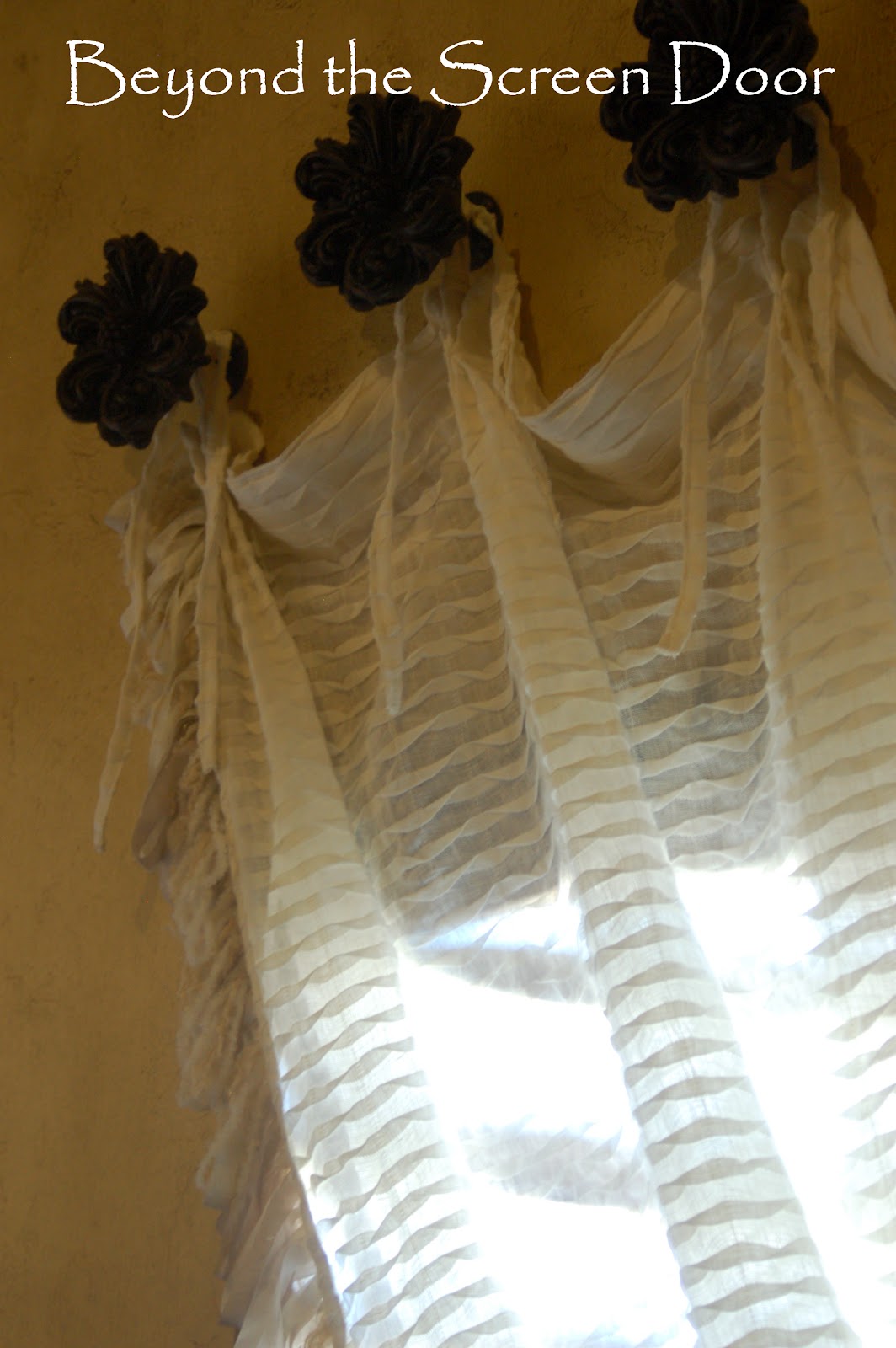 The top is the window treatment was pinch pleated with a loose pleat and long skinny ties made from the same sheer was used to attach the panel to 5 medallions mounted above the window.