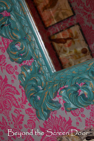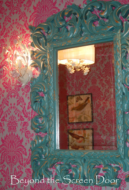 The carved turquoise mirror pops against the pink and silver damask wallpaper.