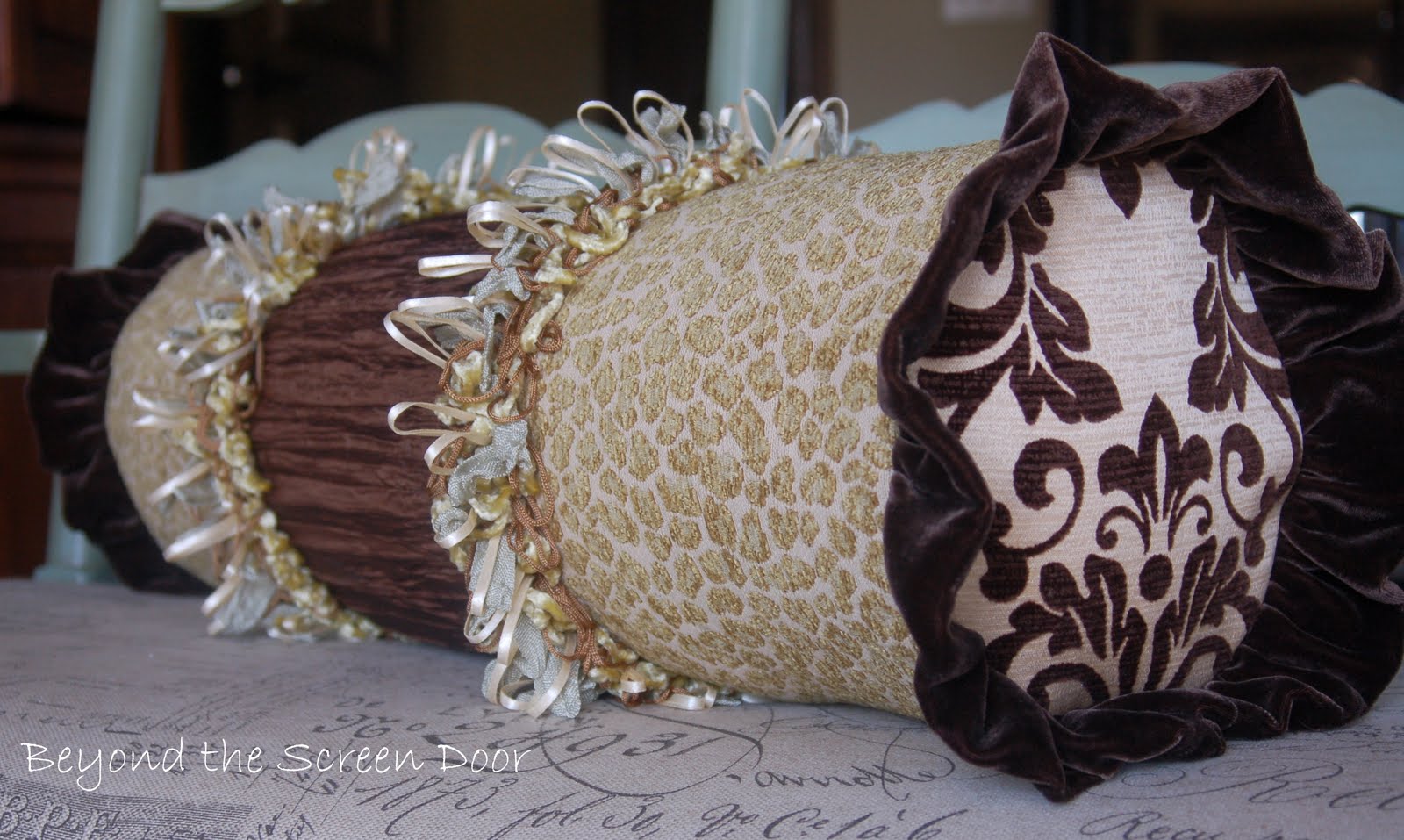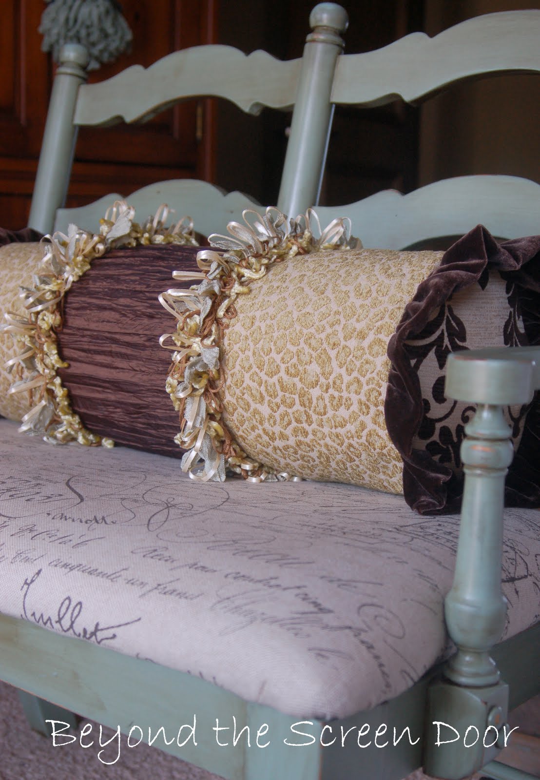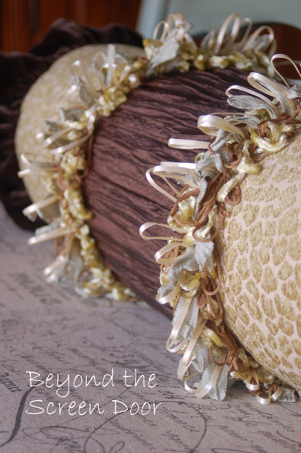2. What a beautiful pillow (and I thought that was your bench!) I love, love the fabrics and trims you used...that chocolate brown is gorgeous!
