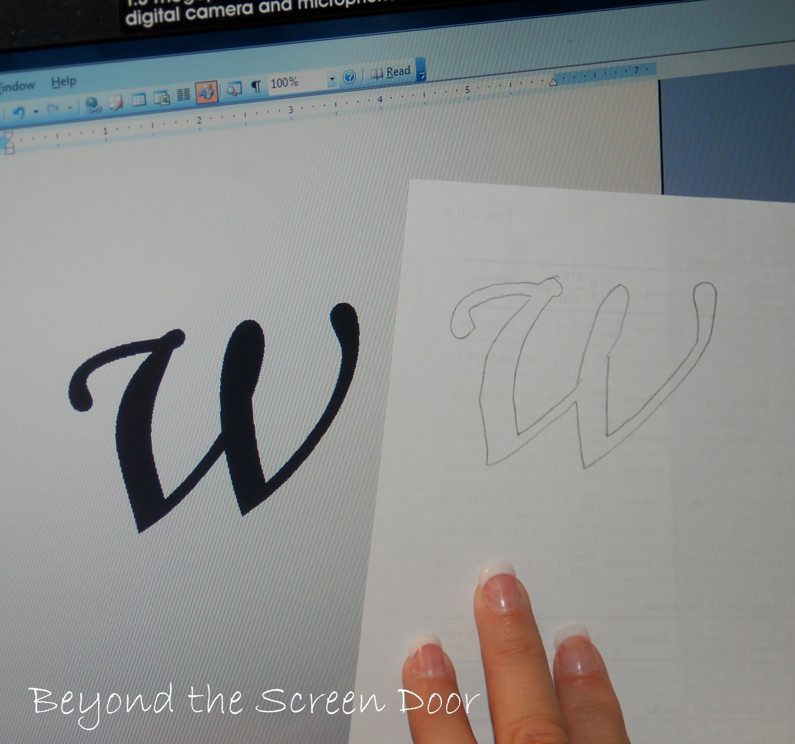 So now, on to the very technical aspect of painting the address. Since we don't own any of the fancy machines that would be oh, so helpful with a project like this, I just choose a font we liked, enlarged it and traced the letters straight from the computer screen.