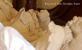 A tip: to keep in mind if you'd like to try this style. Due to the boxing, the size of your pillow insert needs to be larger than the actual pillow cover size. For instance, my pillow inserts were 26" with the pillow cover a 24" square. You could probably even use a 26" feather in a 22-23" pillow cover if you like a tight fit.