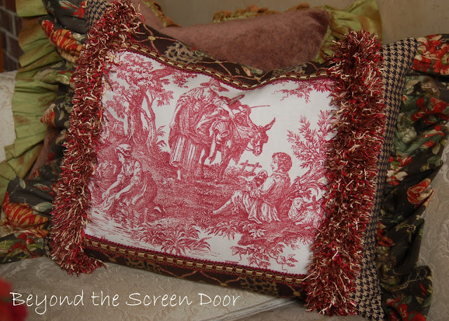Jennifer contacted me a few weeks ago after seeing a few of my own items I had for sale here on the blog. The pillow she wanted had already sold so we decided to make her another one with similar fabrics. Jennifer mailed the red Waverly toile to me to use as the center focal fabric. I was able to use the same fabrics for the back and end ruffles as the original pillow