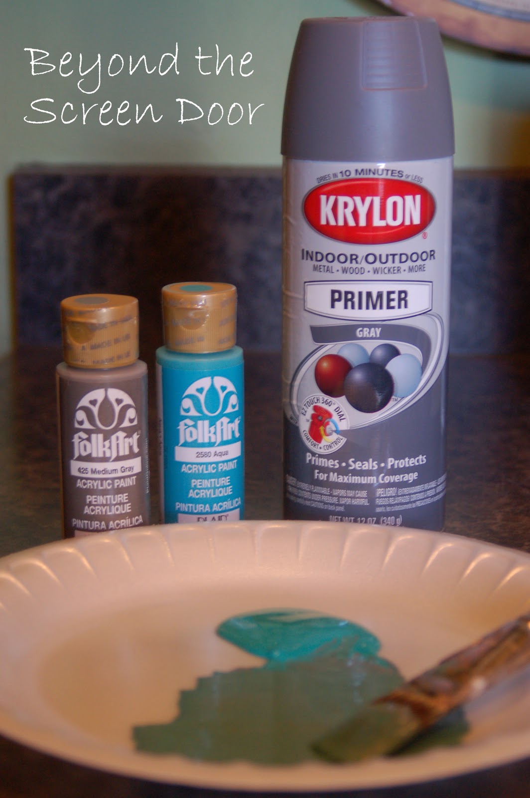 But I already had my heart set on turquoise so I resisted. The color I wanted was a bluish turquoise. Since I couldn't find the exact shade I wanted, I took Aqua and Medium Gray craft paints and mixed them together until I got the color I wanted.