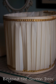 After cutting all the yuckiness off, this is what remained. Using a remnant I'd picked up months ago, I made a new fabric shade. I lined the inside of the shade and added a 2" ruffle of scrim along the bottom edge.