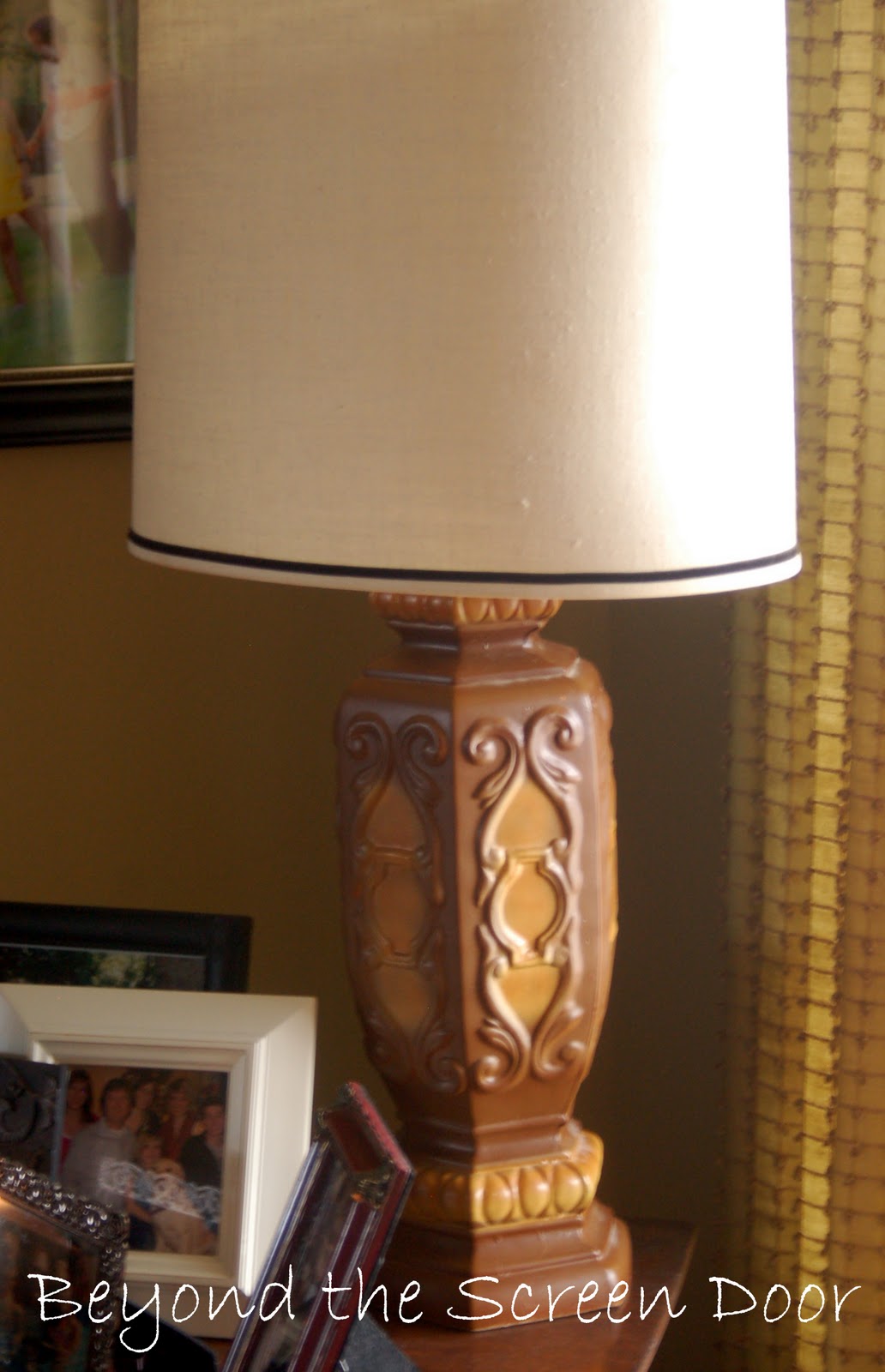 Love the shade...very elegant, much prettier than the before yuckiness! I have the same illness. Life is just too short for plain jane vanilla lampshades!